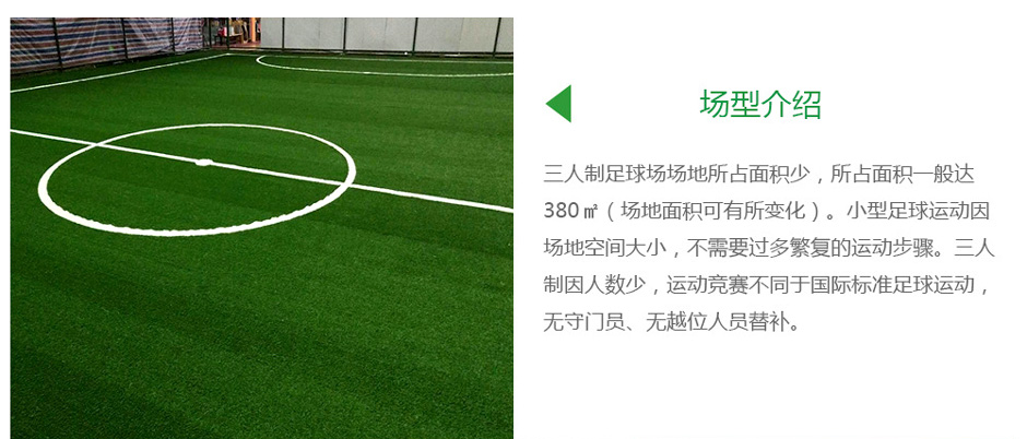 三人制足球场场地所占面积少,所占面积一般达380㎡(场地面积可有所变化)。小型足球运动因场地空间大小,不需要过多繁复的运动步骤。三人制因人数少,运动竞赛不同于国际标准足球运动,无守门员、无越位人员替补。 当下,三人制足球运动在足球运动场地中运用不多,三人制运动场地大多普遍使用于休闲场所,如商务会所、私人会所,或者是小区场所等。小型运动场地大多根据客户需求而特制场地尺寸图纸。